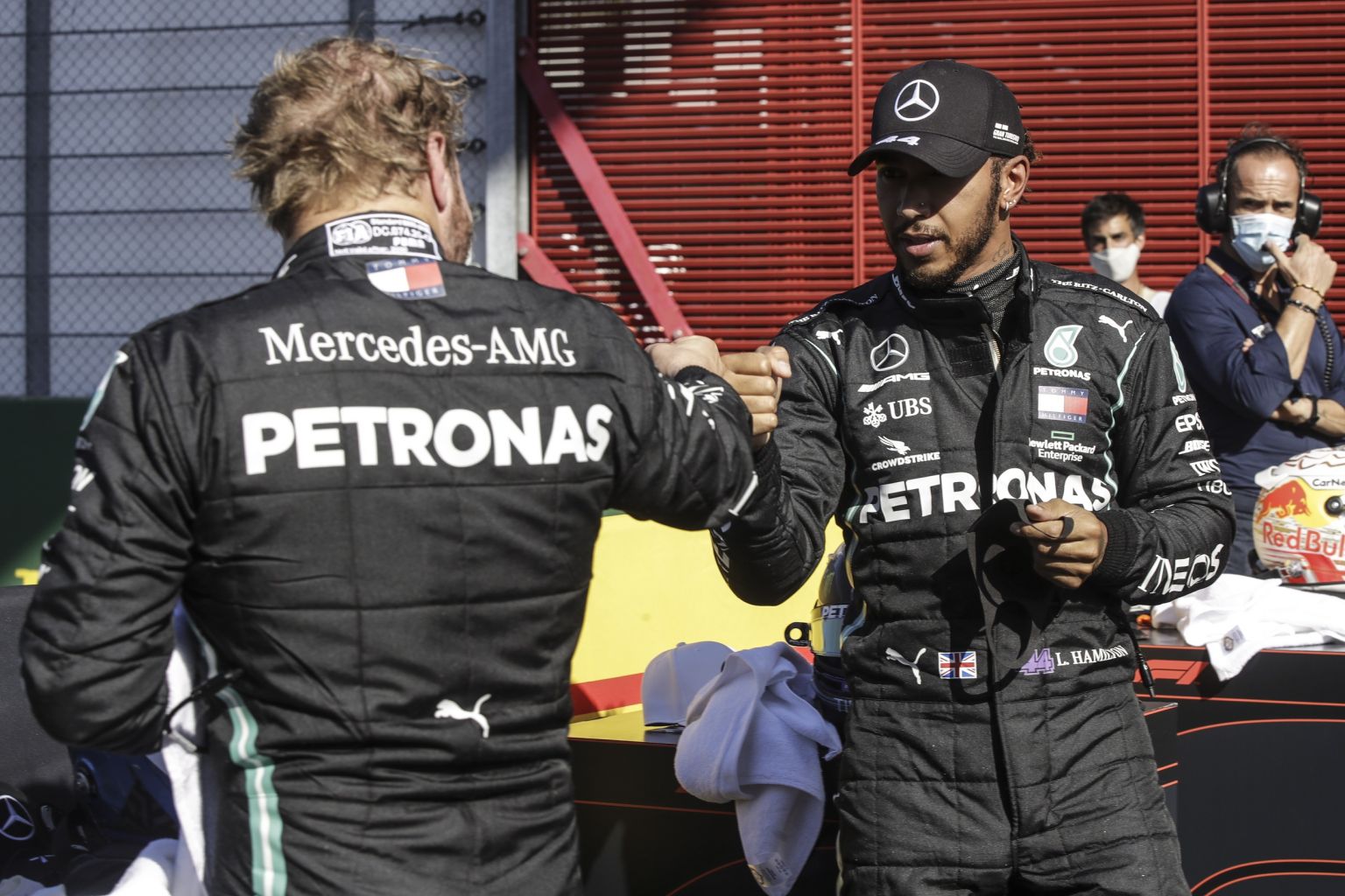 Hamilton (right) and Mercedes teammate Valtteri Bottas bump fists after the qualifying session.