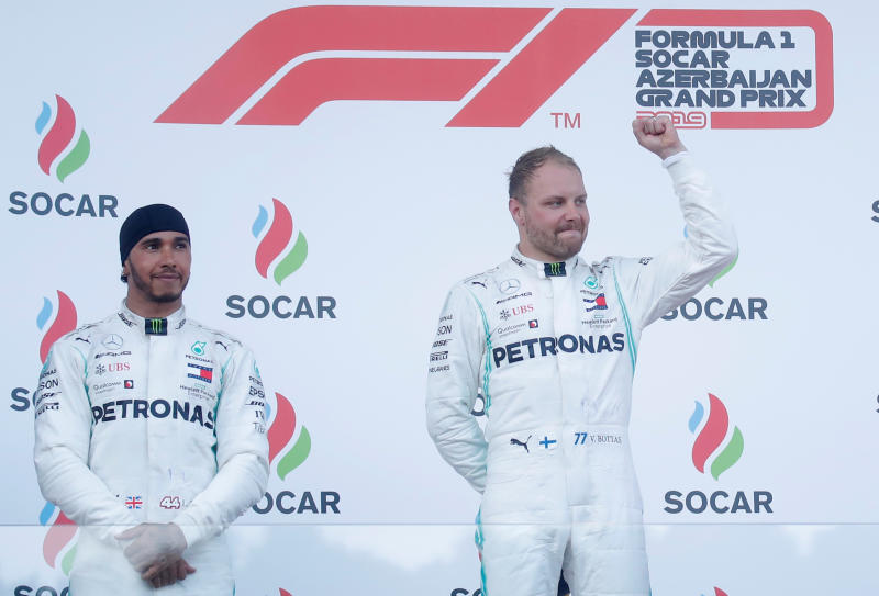 BAKU (AFP) - Lewis Hamilton said he was "too friendly" to his triumphant Mercedes team-mate Valtteri Bottas at the opening corner of Sunday's (April 28) Azerbaijan Grand Prix.