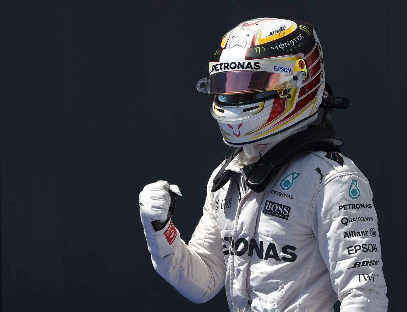 Hamilton celebrates after the qualifying session.