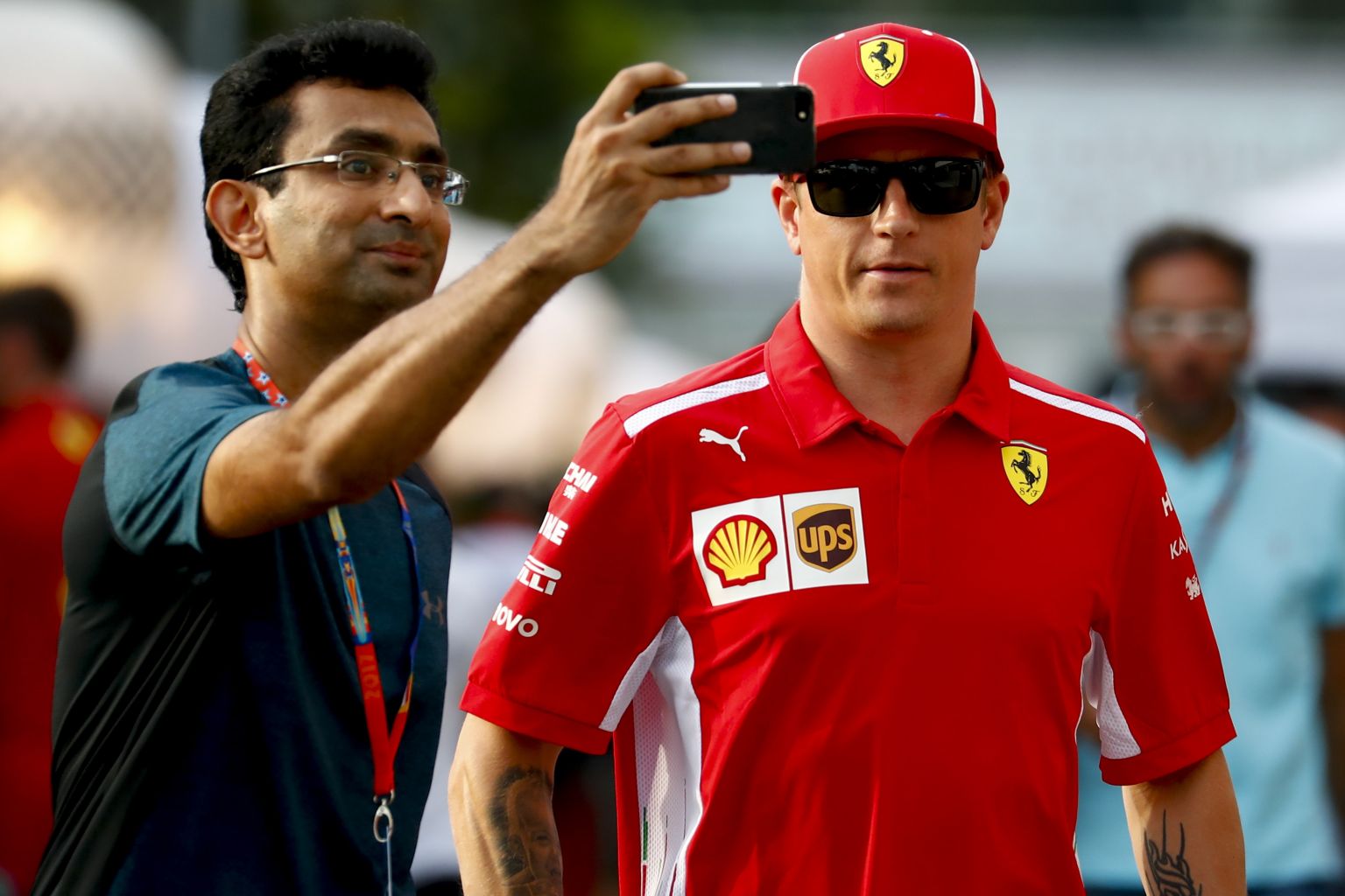 Raikkonen (right) walks in the paddock at the Marina Bay Street Circuit in Singapore.