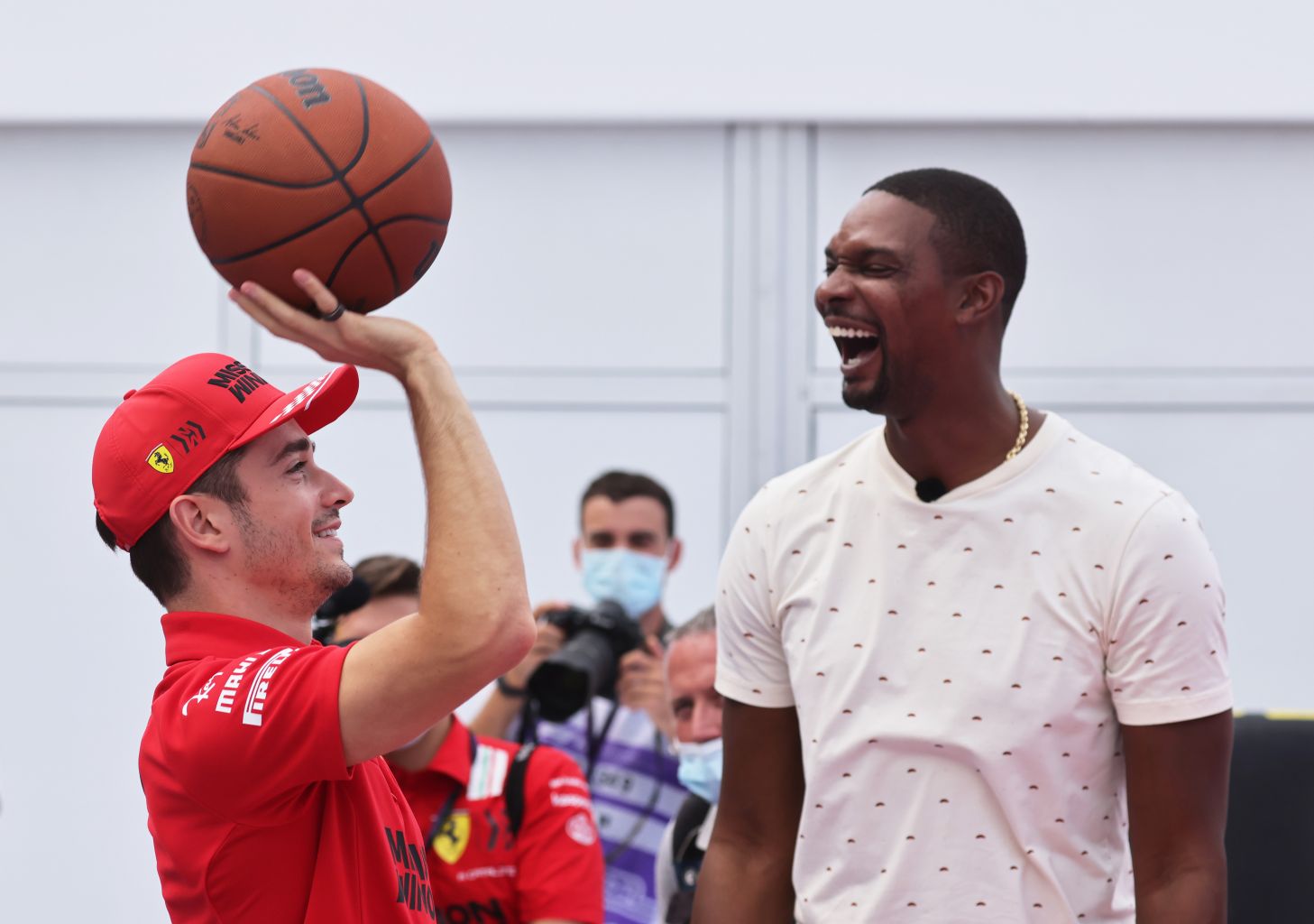Ferrari's Charles Leclerc (left) plays basketball with former player Chris Bosh, ahead of the US grand prix, on Oct 21, 2021.