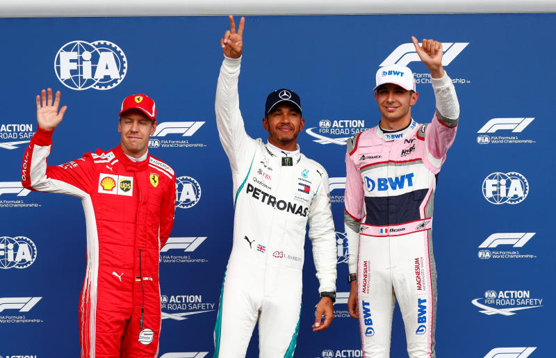 Mercedes' Lewis Hamilton celebrates qualifying in pole position with Ferrari's Sebastian Vettel in second position and Force India's Esteban Ocon in third position.