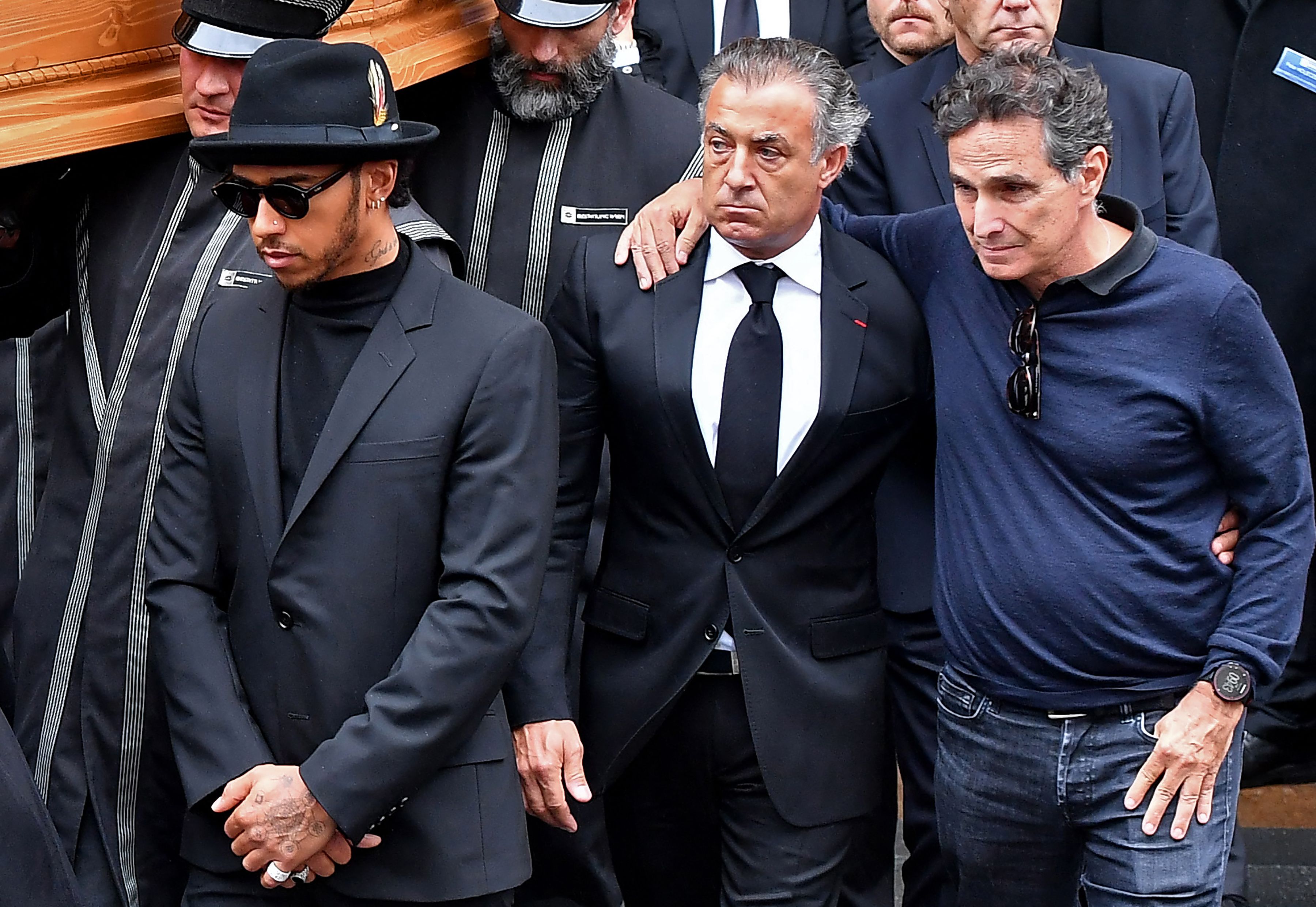 A 2019 photo shows (from left) Lewis Hamilton, former racing driver Jean Alesi and Nelson Piquet at the Vienna funeral of ex-racing driver Niki Lauda.