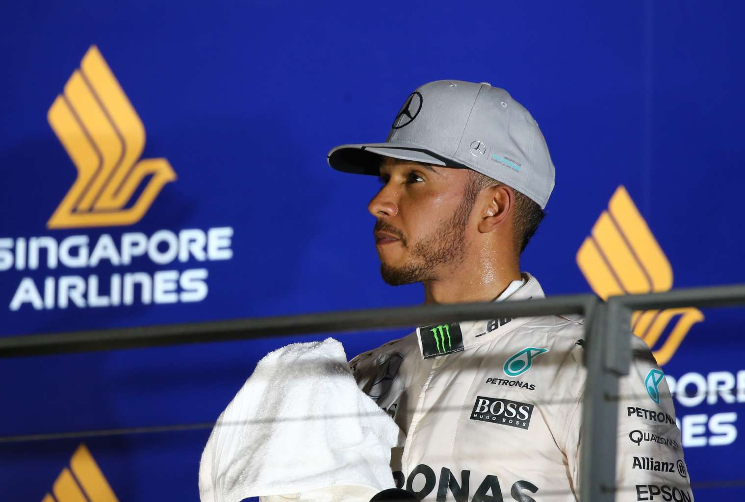 A forlorn Lewis Hamilton at the podium after finishing third to his Mercedes AMG Petronas Formula One teammate and race winner Nico Rosberg at the Formula 1 Singapore Airlines Singapore Grand Prix at the Marina Bay Street Circuit on September 18, 2016.