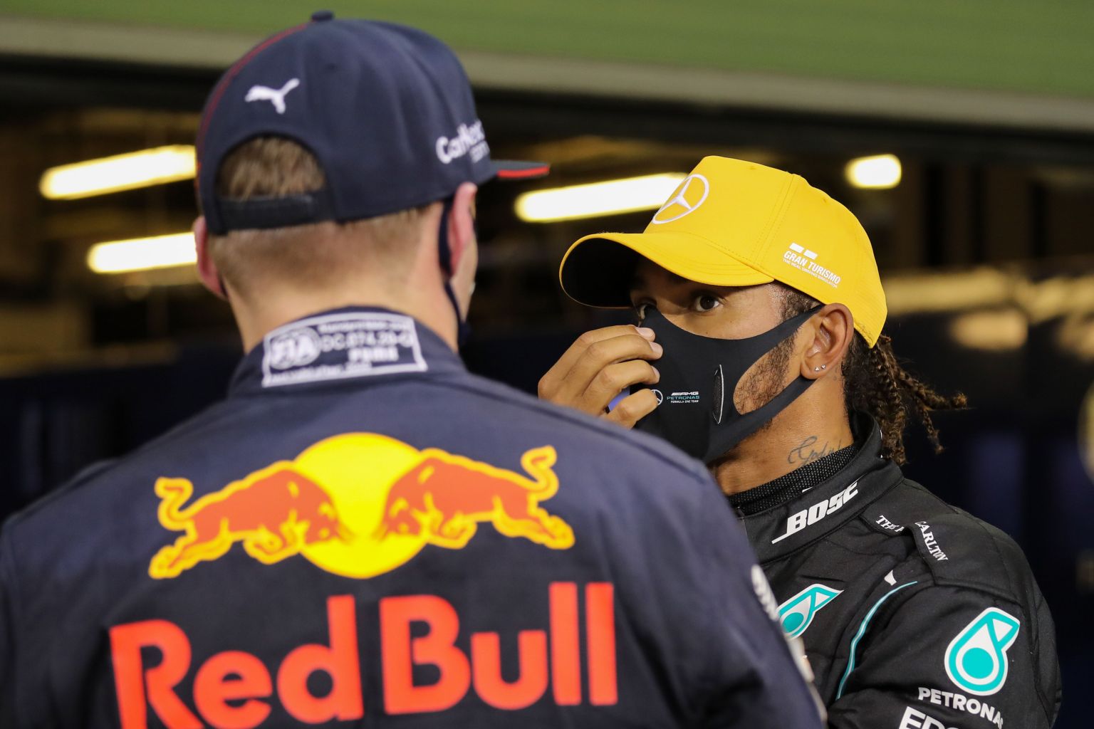 Hamilton (right) and Red Bull's Dutch driver Max Verstappen chat after the qualifying session.