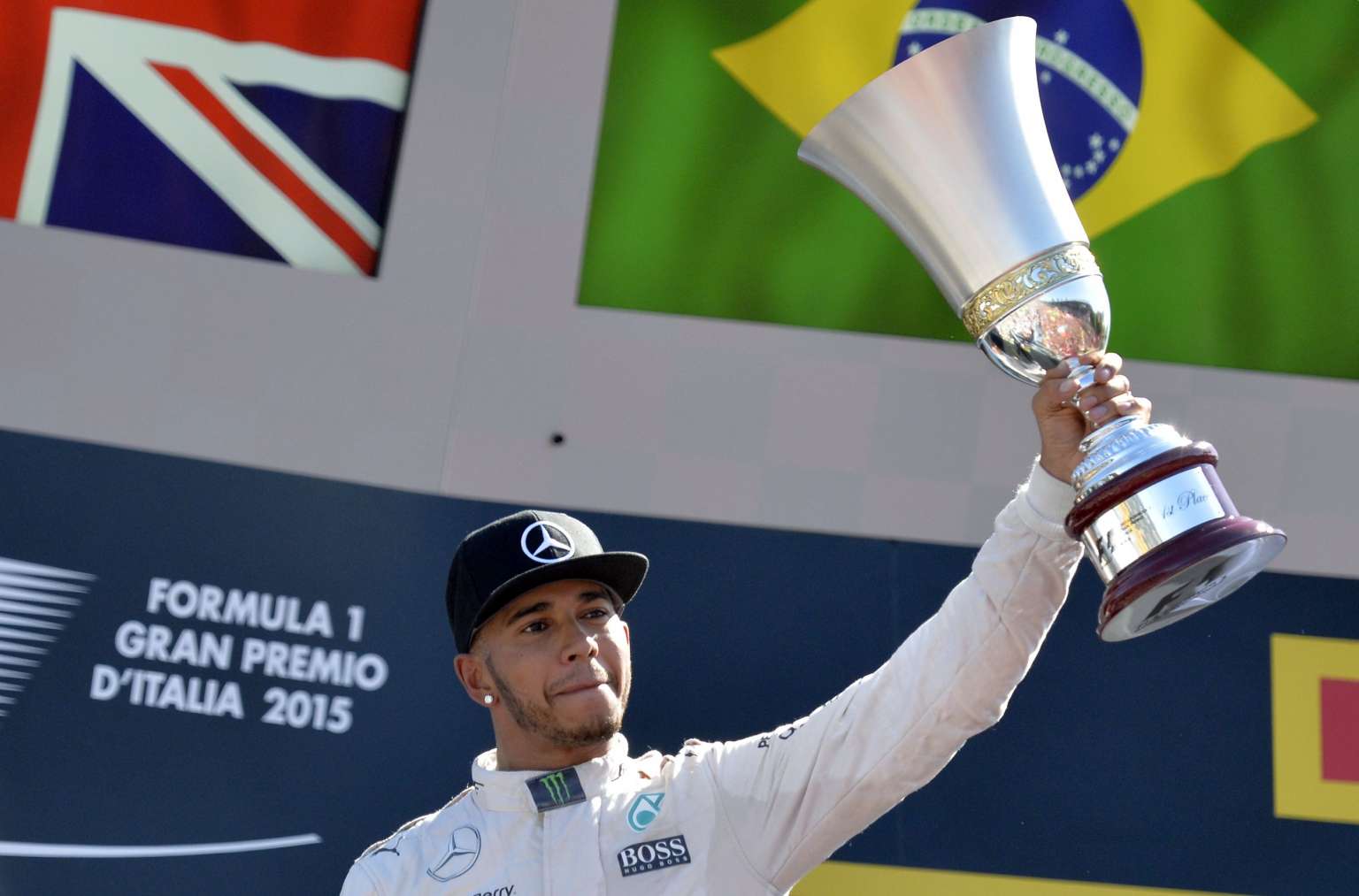 Mercedes AMG Petronas F1 Team's British driver Lewis Hamilton celebrates with his trophy on the podium after winning the Italian Formula One Grand Prix at the Autodromo Nazionale circuit in Monza on Sept 6, 2015.