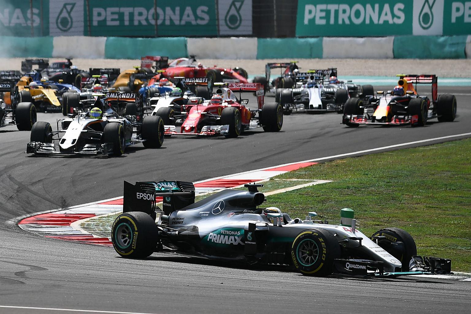 Lewis Hamilton leading the race pack at the start of the Formula One Malaysian Grand Prix in Sepang on Oct 2, 2016.