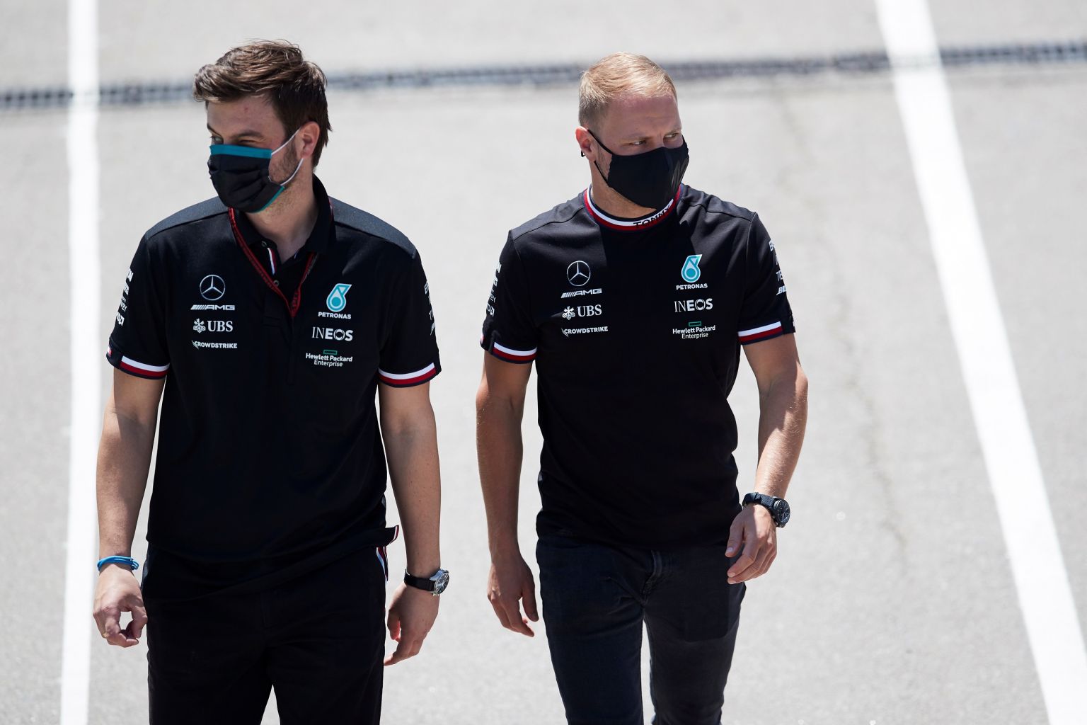 Bottas (right) walks on the paddock prior to the drivers' press conference for the Spanish grand prix.