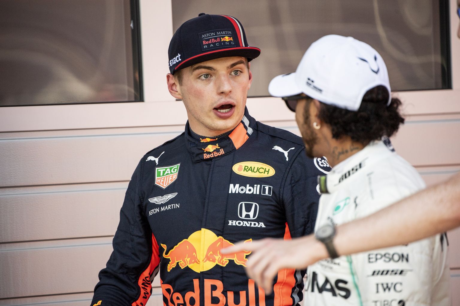 Verstappen (left) talks to Lewis Hamilton after the qualifying session for the Austrian grand prix.