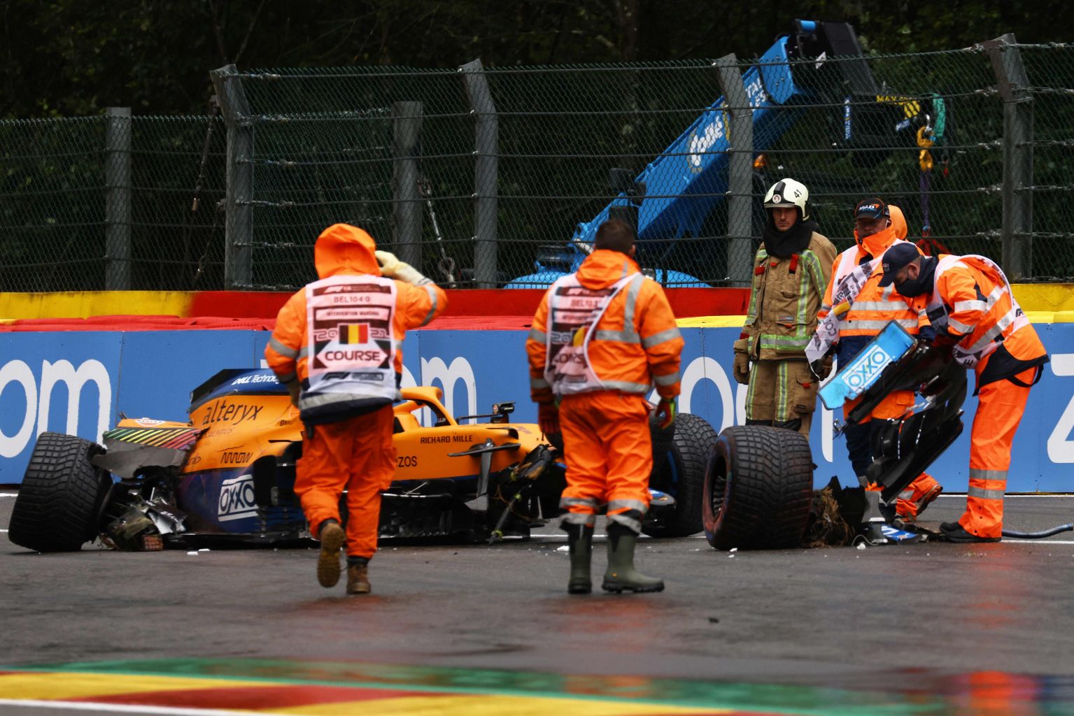 Race marshalls and technicians clear Norris' McLaren car after he crashed during the qualifying session for the Belgian grand prix.