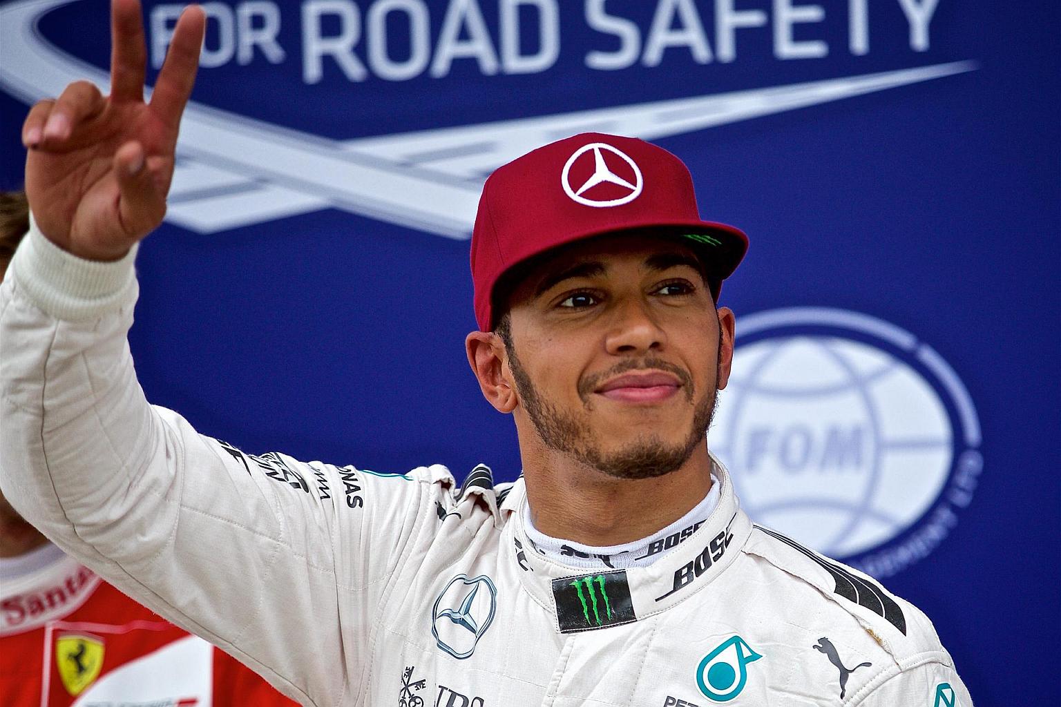 Lewis Hamilton of Mercedes AMG GP reacts after he got the pole position for the qualification session at the Gilles-Villeneuve circuit in Montreal, Canada.