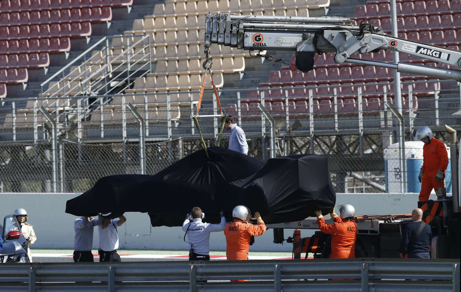 A covered Mercedes F1 car is removed from the track by the mechanics.