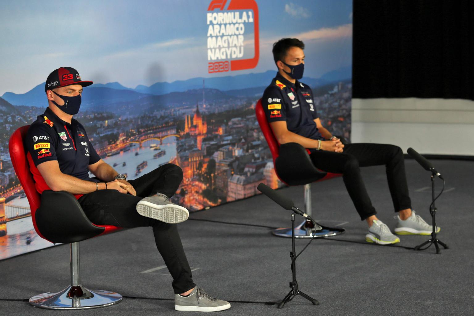 (From left) Max Verstappen and Alex Albon at a press conference for the Formula One Hungarian Grand Prix, on July 16, 2020.