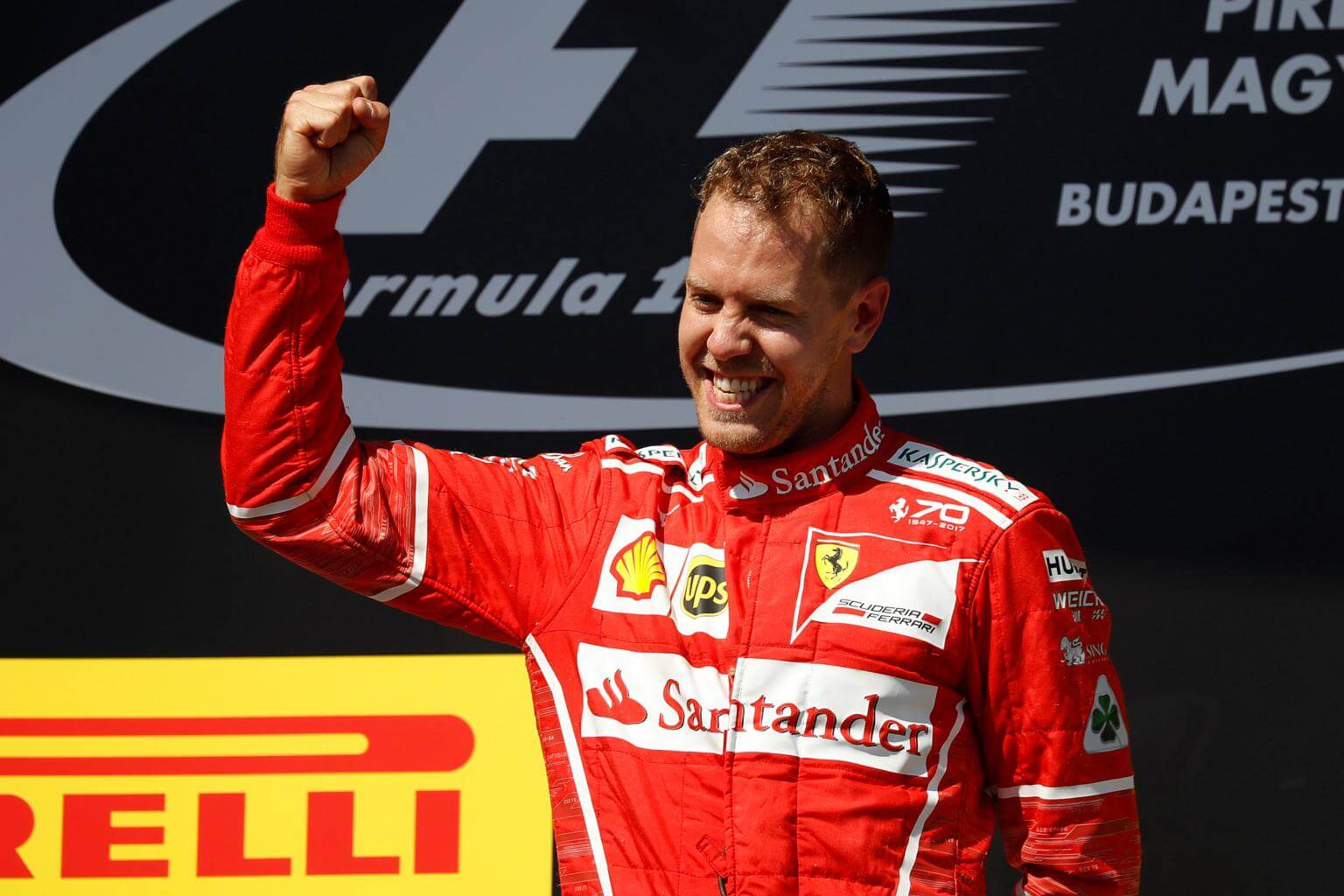 Ferrari's Sebastian Vettel celebrates winning the race on the podium at Hungarian Grand Prix in Budapest, Hungary, on July 30, 2017.