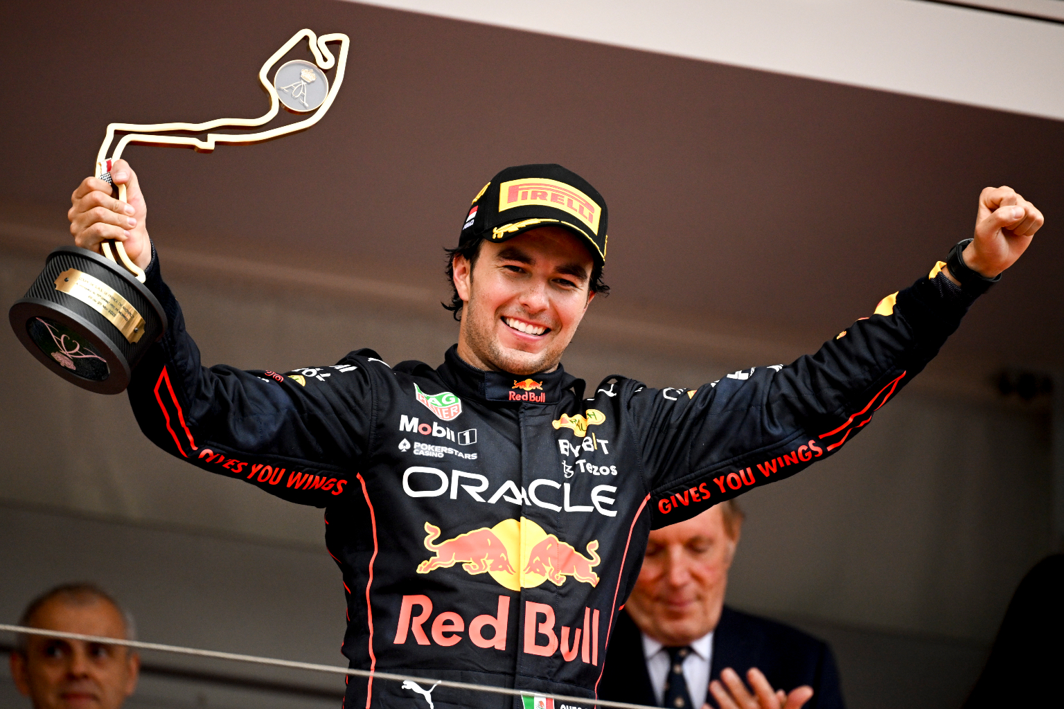 Sergio Perez celebrates on the podium after winning the Formula One Grand Prix of Monaco, on May 29, 2022.