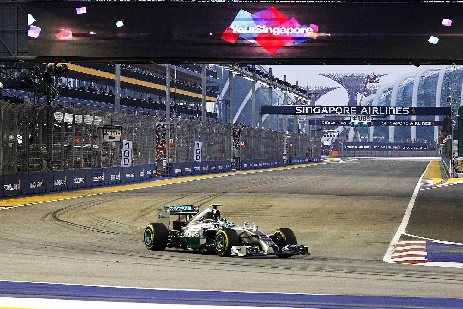 Nico Rosberg driving past during the first practice session of the 2014 F1 Singapore Airlines Singapore Grand Prix.