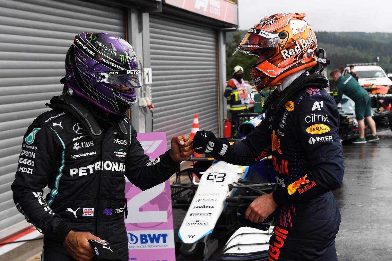 <p>Red Bull's Dutch driver Max Verstappen (R) celebrates taking pole position in with third-placed Mercedes' British driver Lewis Hamilton in the parc ferme after the qualifying session of the Formula One Belgian Grand Prix at the Spa-Francorchamps circuit in Spa on August 28, 2021. (Photo by JOHN THYS / POOL / AFP)</p>