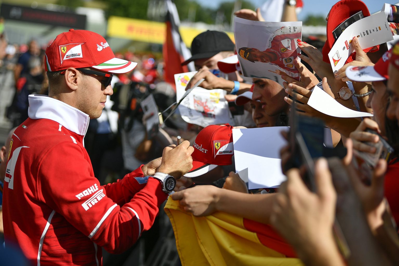 Vettel signs autographs at the Hungaroring racetrack, July 27, 2017.