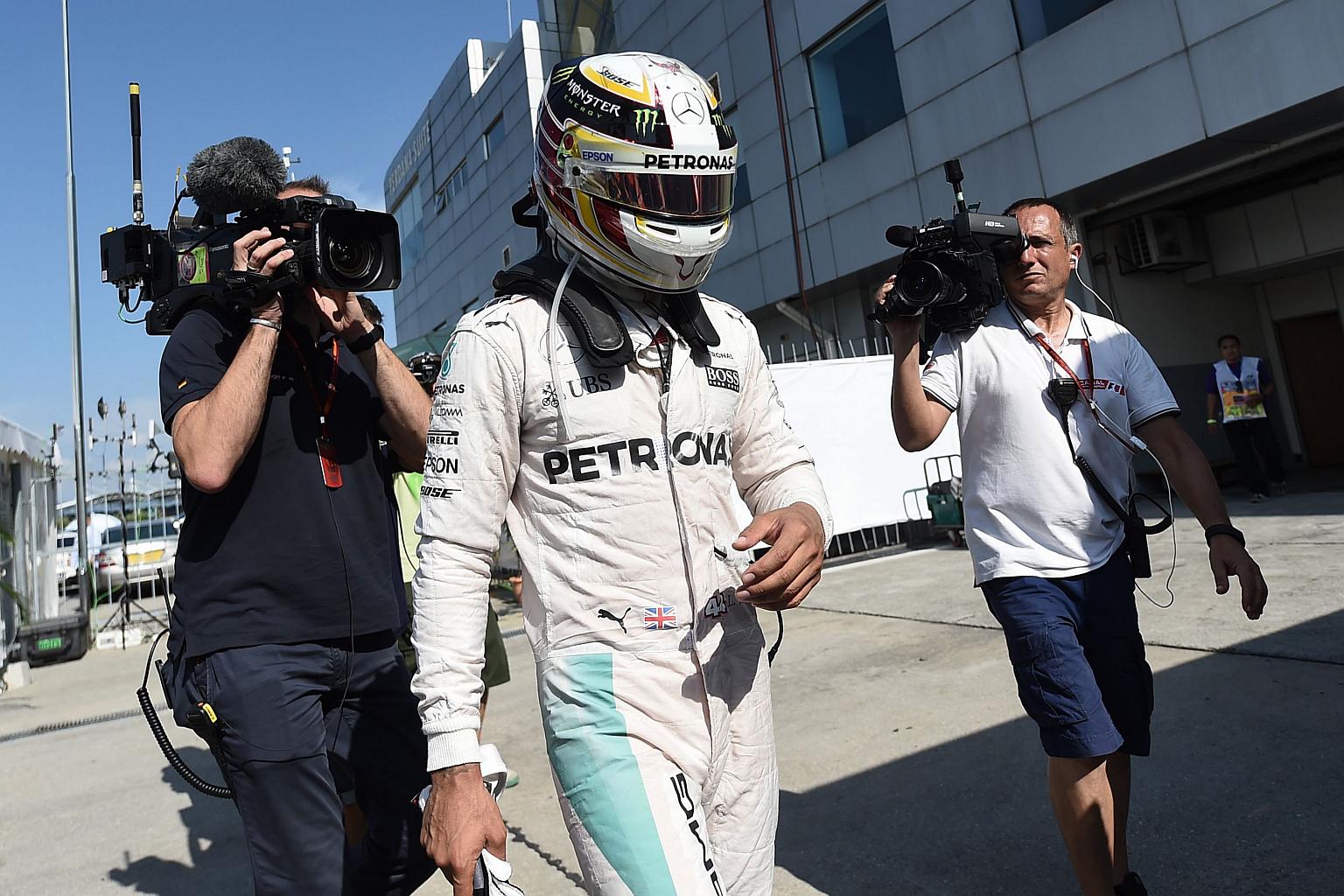 Mercedes AMG Petronas F1 Team's British driver Lewis Hamilton arrives the pit, after his car engine caught fire during the Formula One Malaysian Grand Prix in Sepang on Oct 2, 2016.