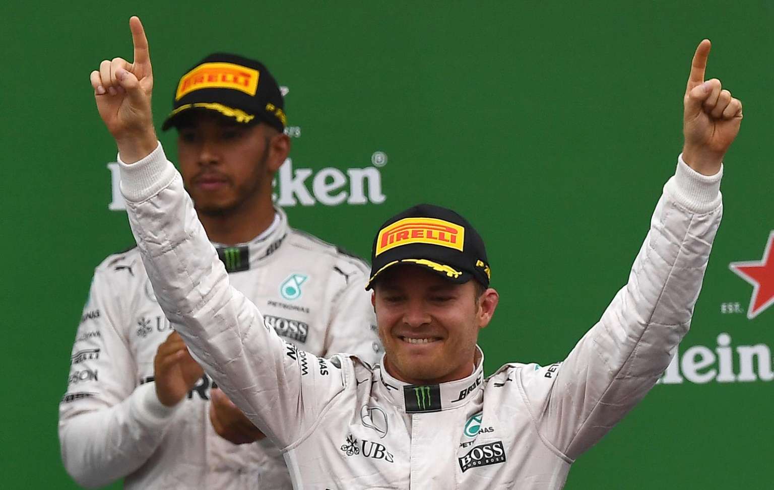 Mercedes F1 star Nico Rosberg (right) celebrates on the podium next to teammate Lewis Hamilton following the Sept 4 Italian Formula One Grand Prix.
