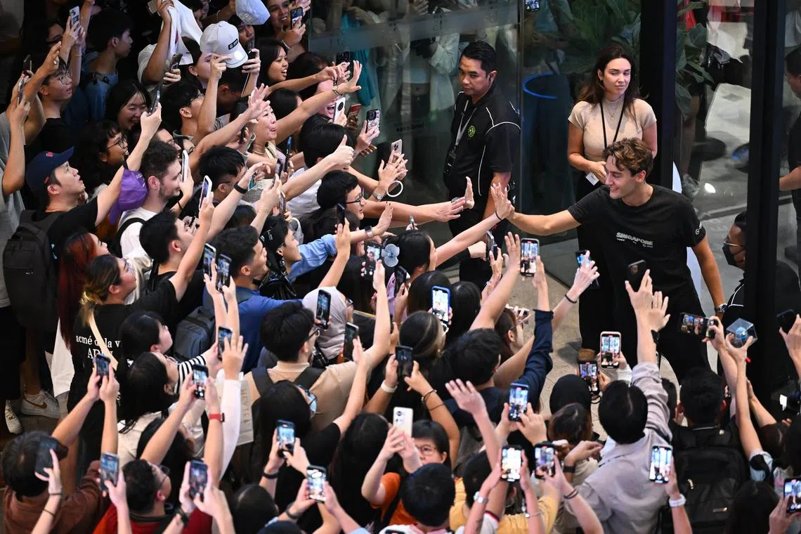 George Russell checks out the queue of fans waiting outside Puma Flagship Store at 313@somerset on Sept 18.