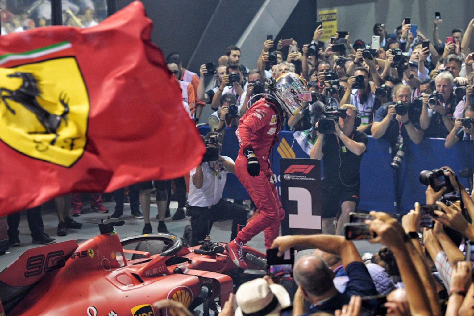 Formula One driver Sebastian Vettel of Scuderia Ferrari celebrates after winning the Formula 1 2019 Singapore Airlines Grand Prix at the Marina Bay Street Circuit on Sept 22, 2019.