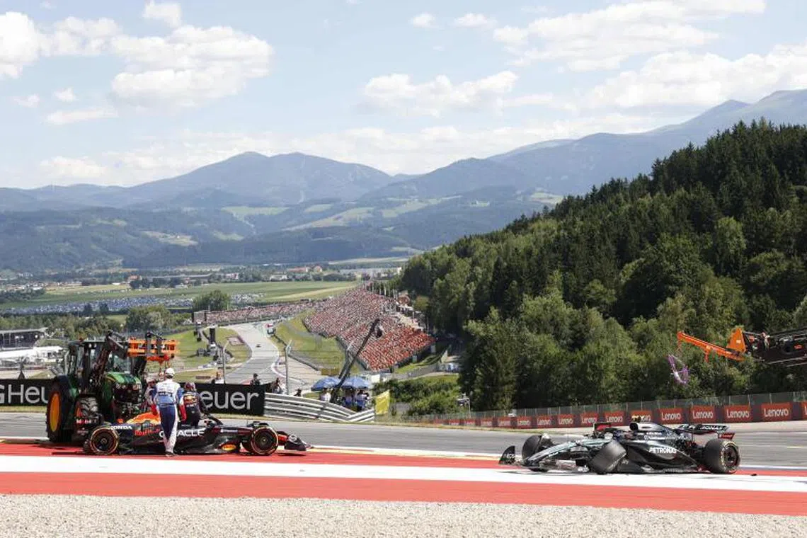 The damaged cars of Red Bull’s Dutch driver Max Verstappen (left) and Mercedes’ Italian driver Kimi Antonelli after their crash at the race track.
