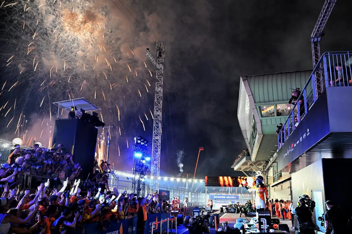 As fireworks lit up the Marina Bay skyline, Norris took the chequered flag in 1hr 40min 52.571sec, finishing a whopping 20.945 seconds ahead of Verstappen and 41.823sec ahead of McLaren teammate Oscar Piastri.