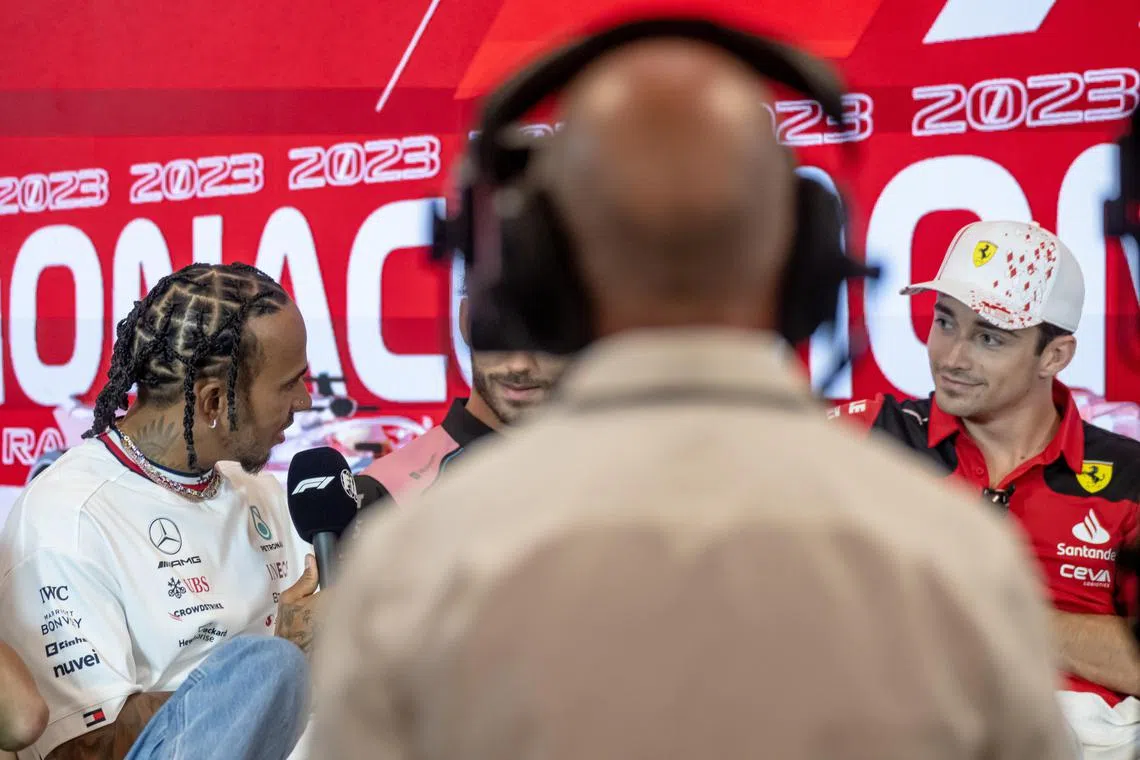 Mercedes’ Lewis Hamilton (left) and Ferrari’s Charles Leclerc (right) at the drivers’ press conference ahead of the Monaco grand prix.