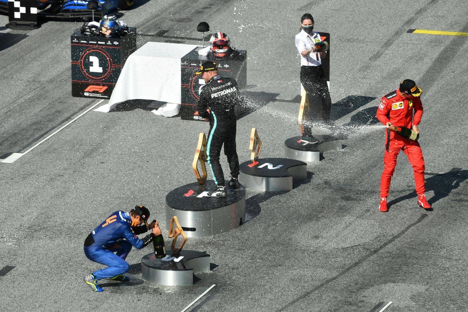 Winner Mercedes' Valtteri Bottas, runner-up Ferrari's Charles Leclerc (in red) and third-placed McLaren's Lando Norris (in blue) celebrating with champagne after the Austrian Grand Prix on July 5, 2020.