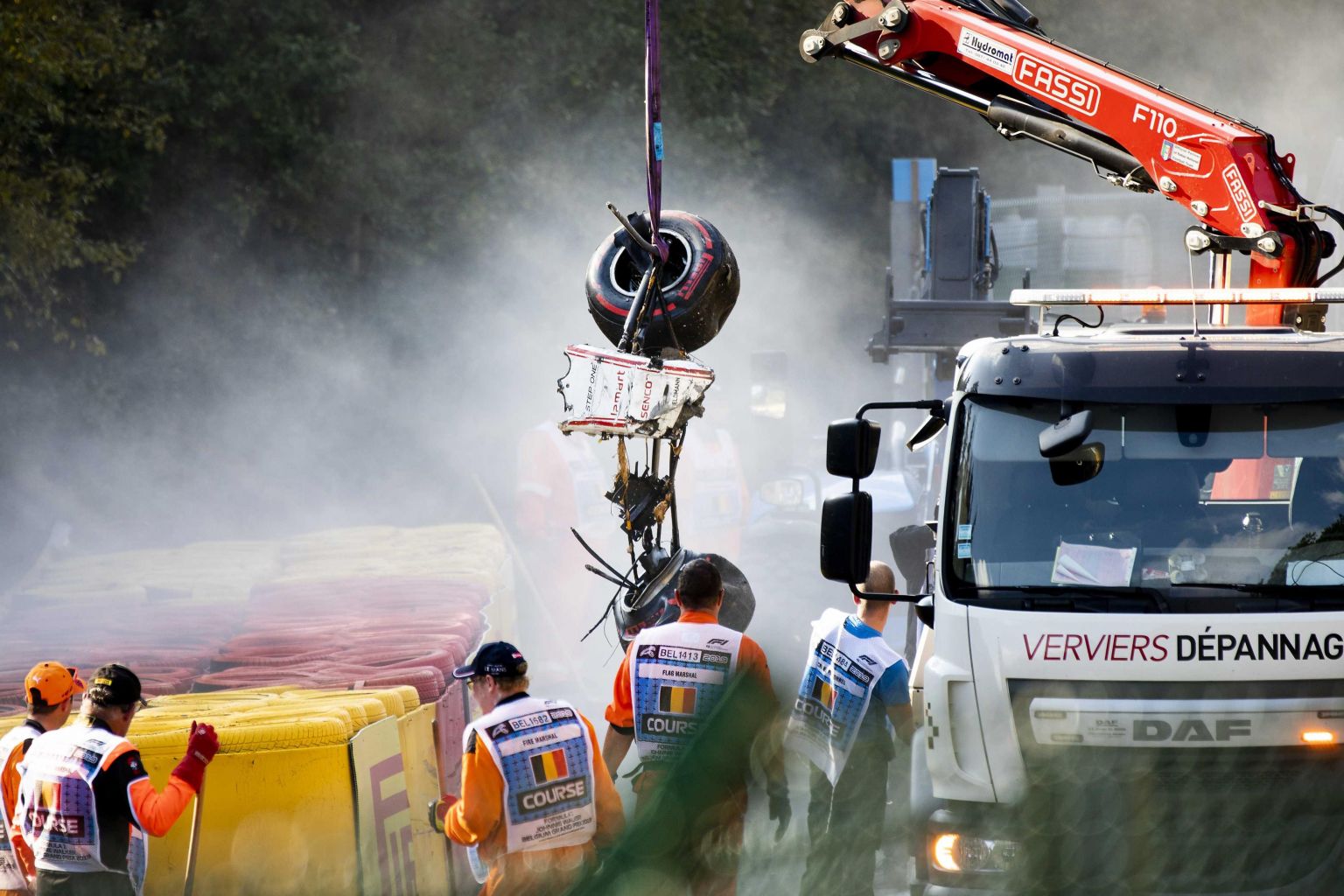 The car wreck of Juan Manuel Correa being removed during the Formula 2 race at the Spa-Francorchamps race track in Stavelot, Belgium, on Aug 31, 2019.