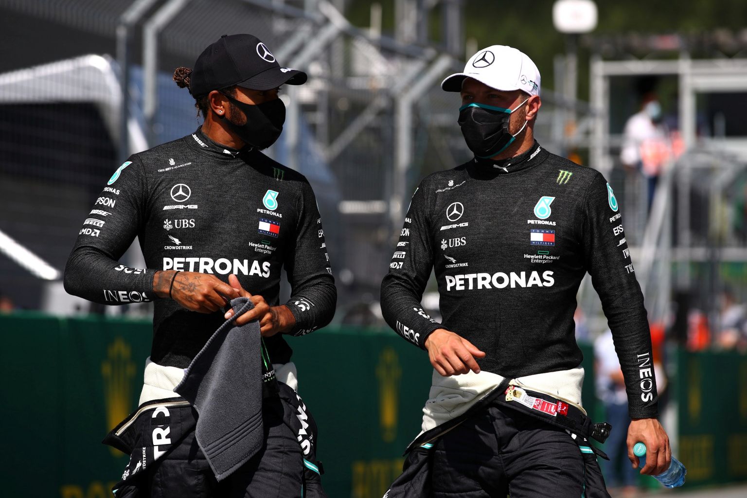 Mercedes' Lewis Hamilton and Valtteri Bottas wearing protective face masks after qualifying.