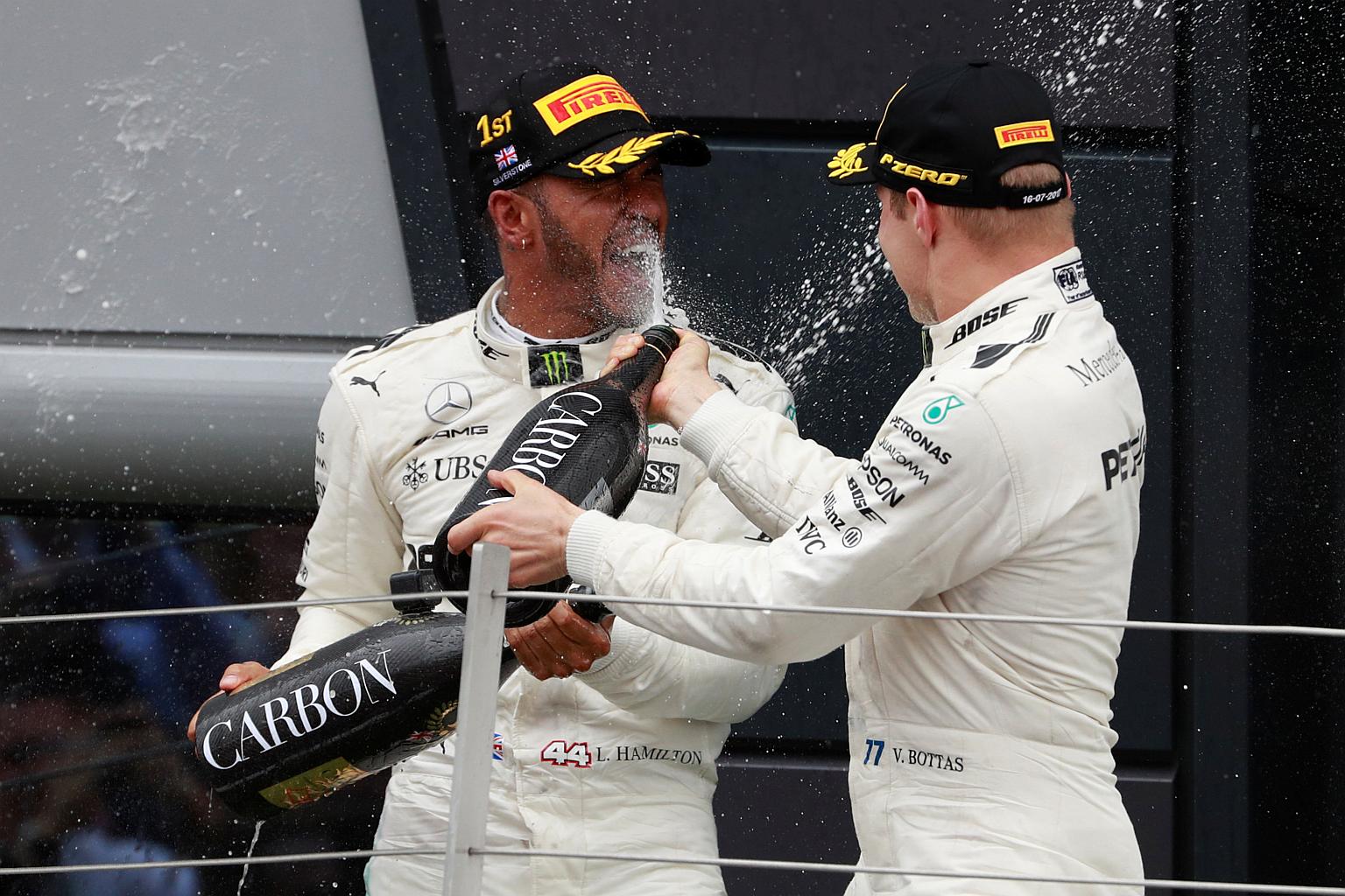 Mercedes' Lewis Hamilton celebrates his win on the podium with Mercedes' Valtteri Bottas on July 16, 2017.