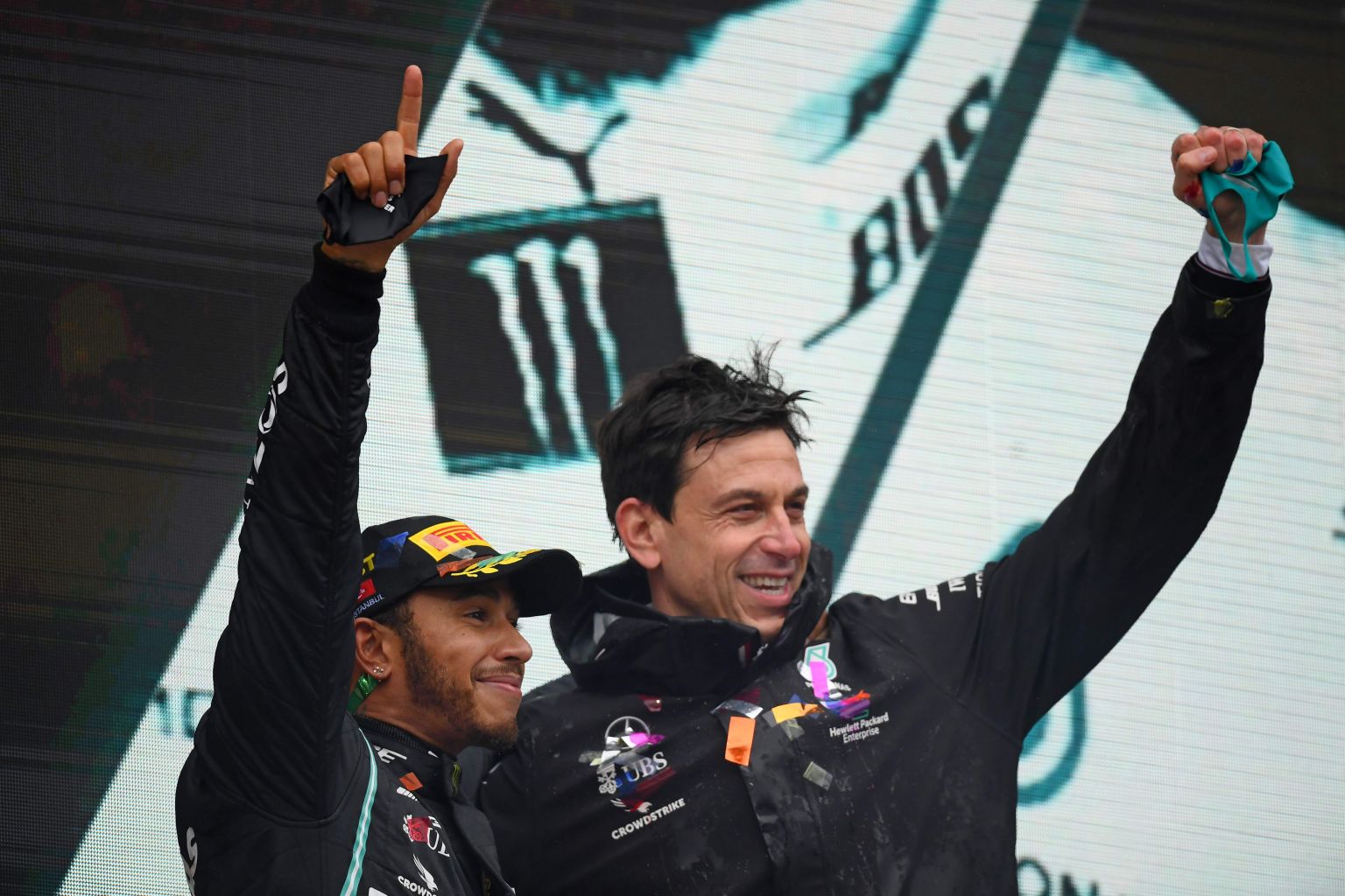 Hamilton (left) and Wolff wave from the podium after winning the Turkish Grand Prix in November 2020.