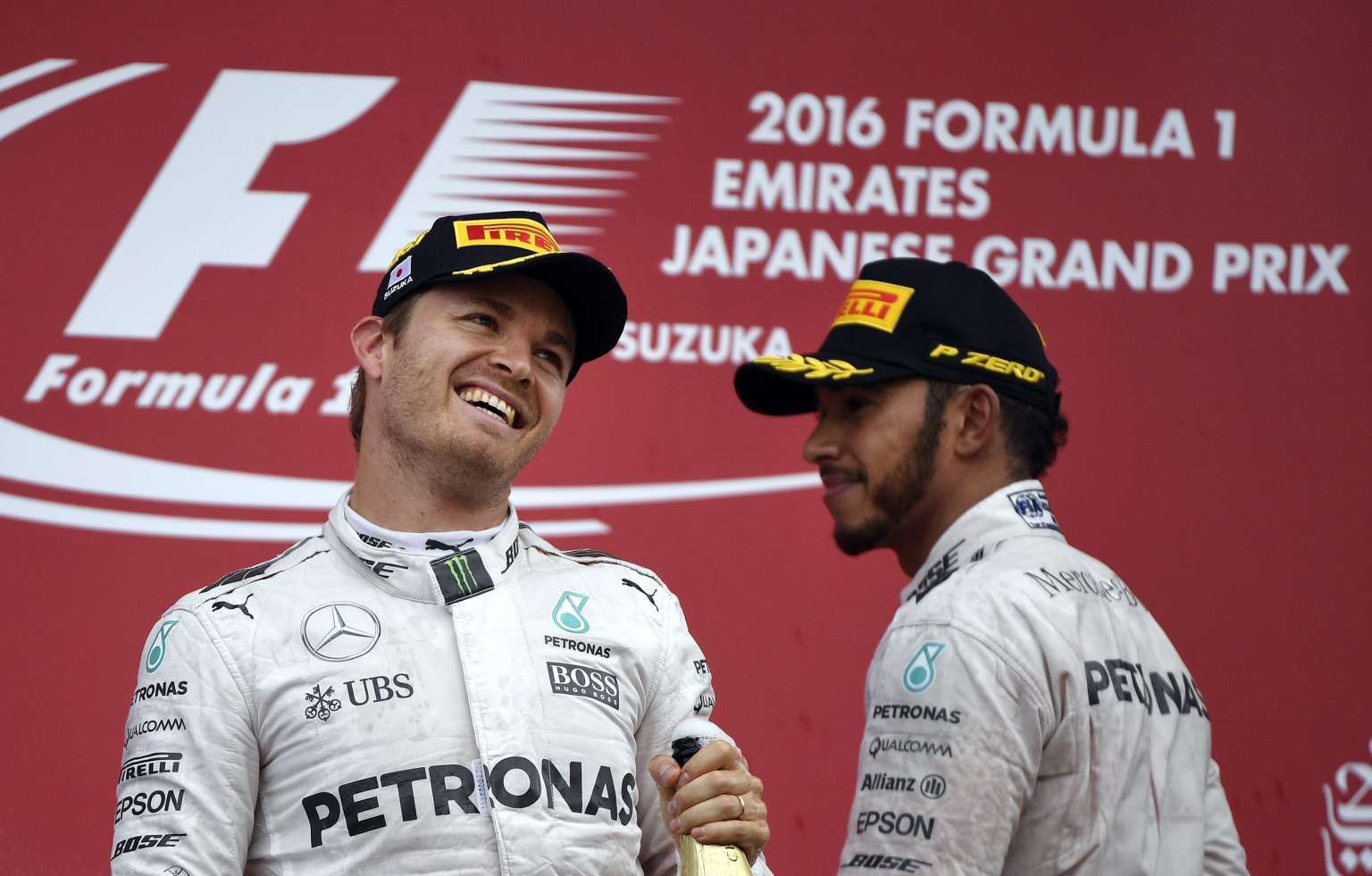 Nico Rosberg (left) celebrates on the podium with third placed Lewis Hamilton, after winning the Japanese Formula One Grand Prix on Oct 9, 2016.