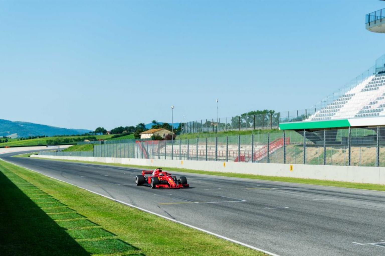 F1 driver Sebastian Vettel driving a 2018-spec Ferrari at Mugello, in preparation for the season restart.