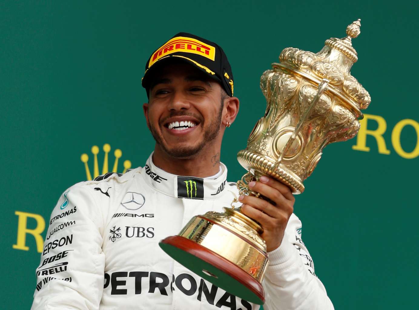 Mercedes' Lewis Hamilton celebrates his win on the podium for the British Grand Prix 2017 in Silverstone, Britain on July 16, 2017.