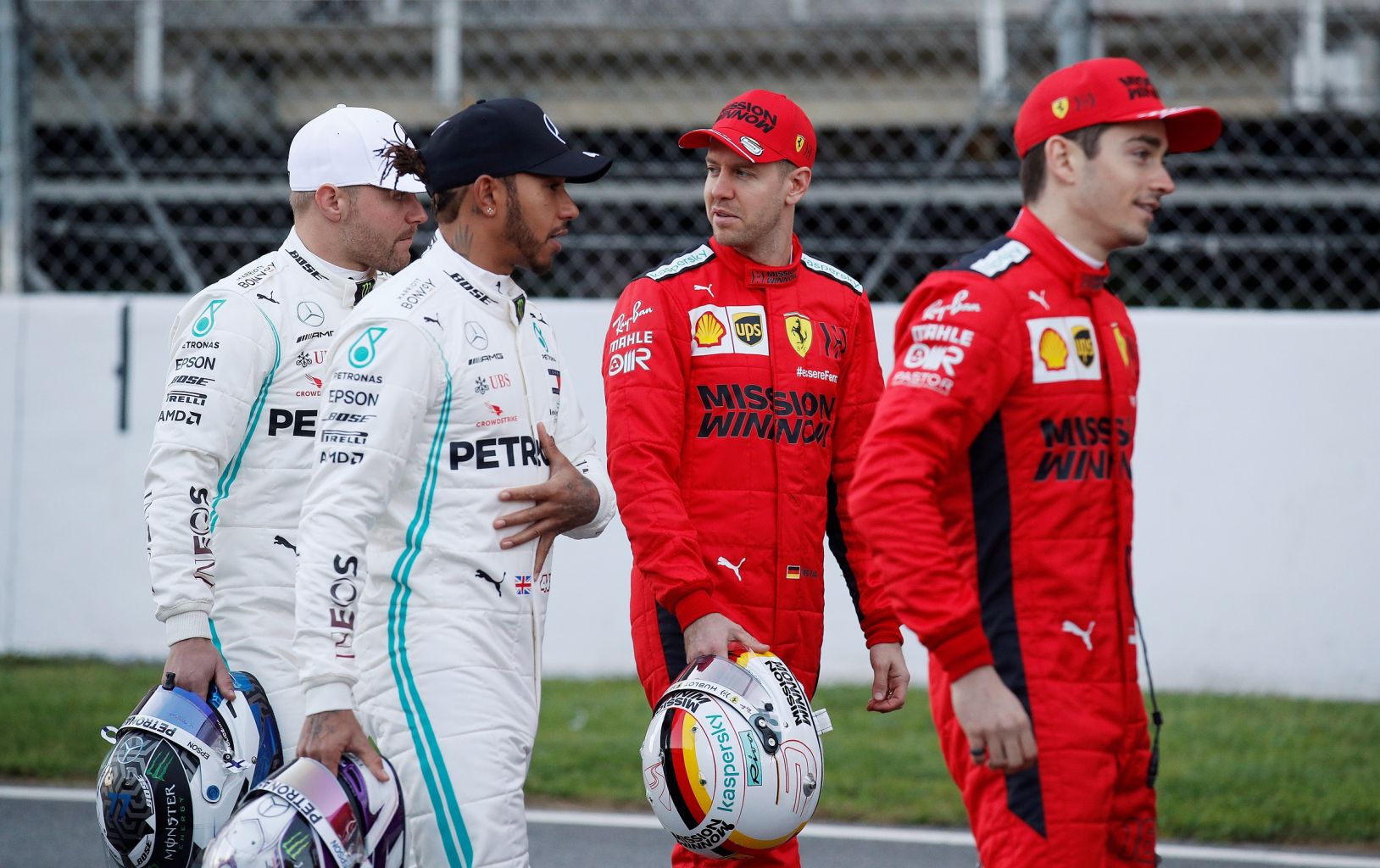 F1 drivers (from left) Valtteri Bottas, Lewis Hamilton, Charles Leclerc and Sebastian Vettel ahead of 2020 testing in Barcelona, Spain.