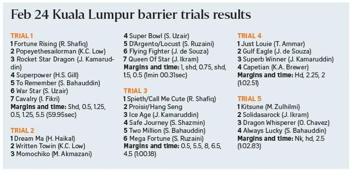 There was no such trouble this time and Dream Ma (Haikal Hanif) passed his test, beating Written Towin (Low Kang Cheng) by a length. The Headwater four-year-old lines up with 11 others in Race 11 on Feb 28.