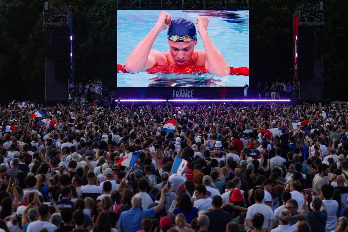 Supporters celebrate France’s Leon Marchand winning the men’s 200m individual medley on Aug 2.