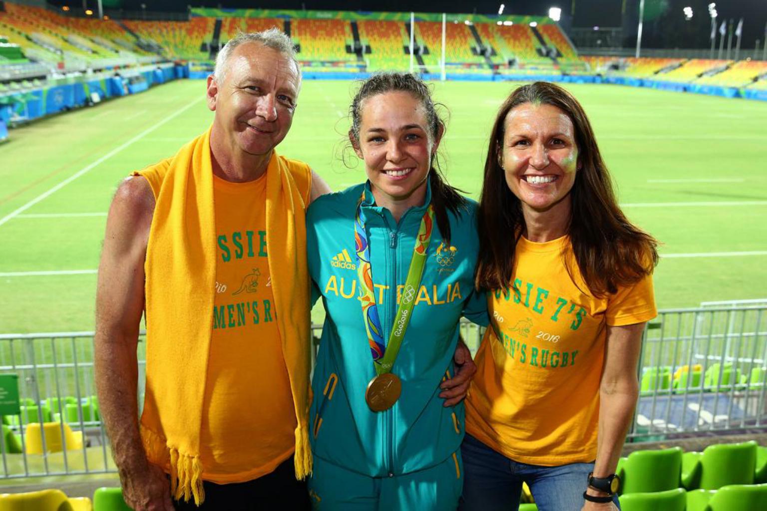 Australia rugby sevens Olympic champion Chloe Dalton (centre) with her parents.