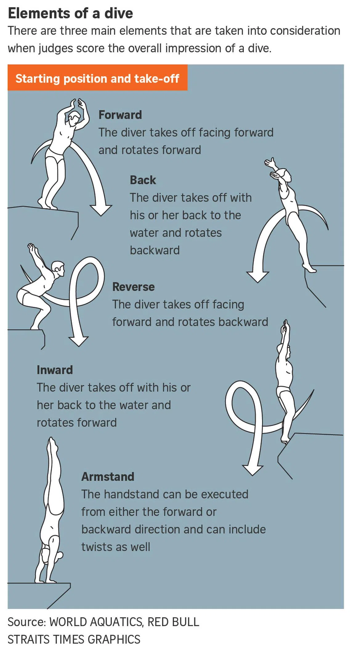 - High diving involves athletes diving from platforms of 27m (men) and 20m (women), reaching speeds of up to 85kmh - they are judged on difficulty and execution.