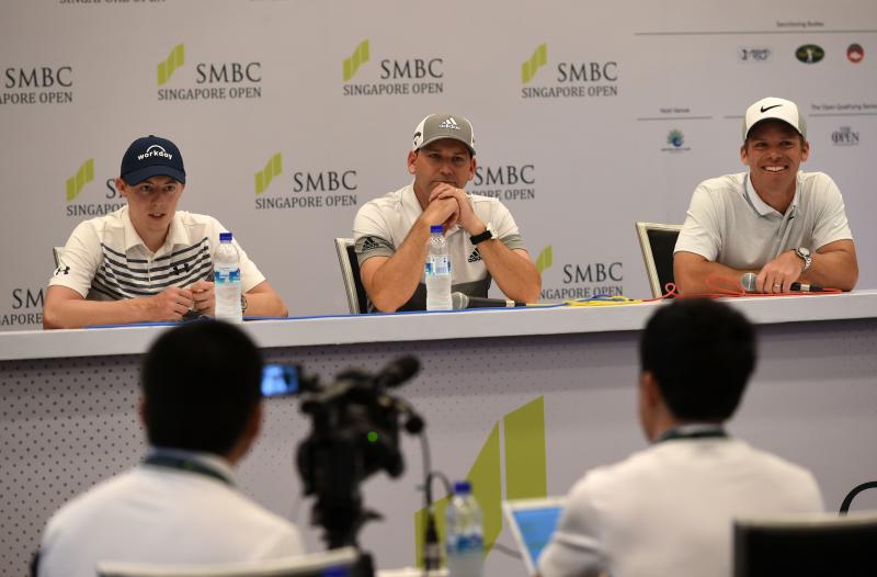 (From left) Matthew Fitzpatrick, Sergio Garcia of Spain and Paul Casey of England attend a press conference ahead of the Singapore Open golf tournament at Sentosa Golf Club in Singapore on Jan 15, 2019.