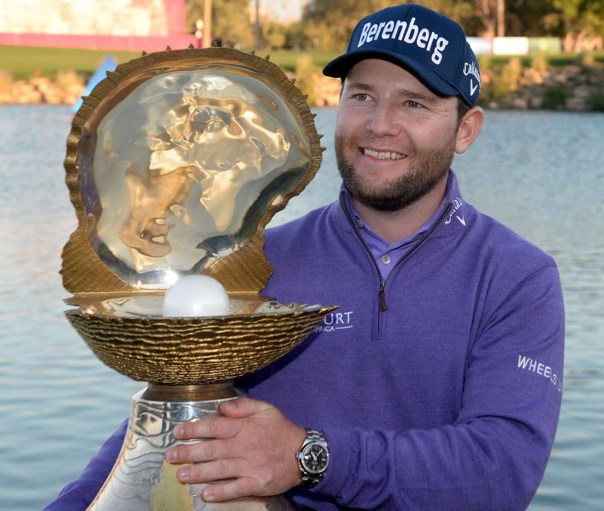 Branden Grace of South Africa poses with the winners trophy after the final round of the Qatar Masters.