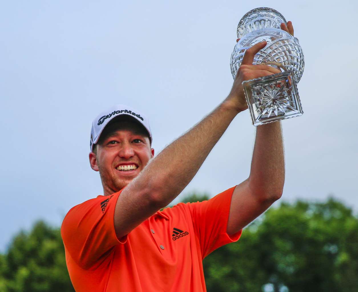 Daniel Berger of the US raises his trophy after winning the FedEx St Jude Classic in Memphis, Tennessee, on June 12, 2016.