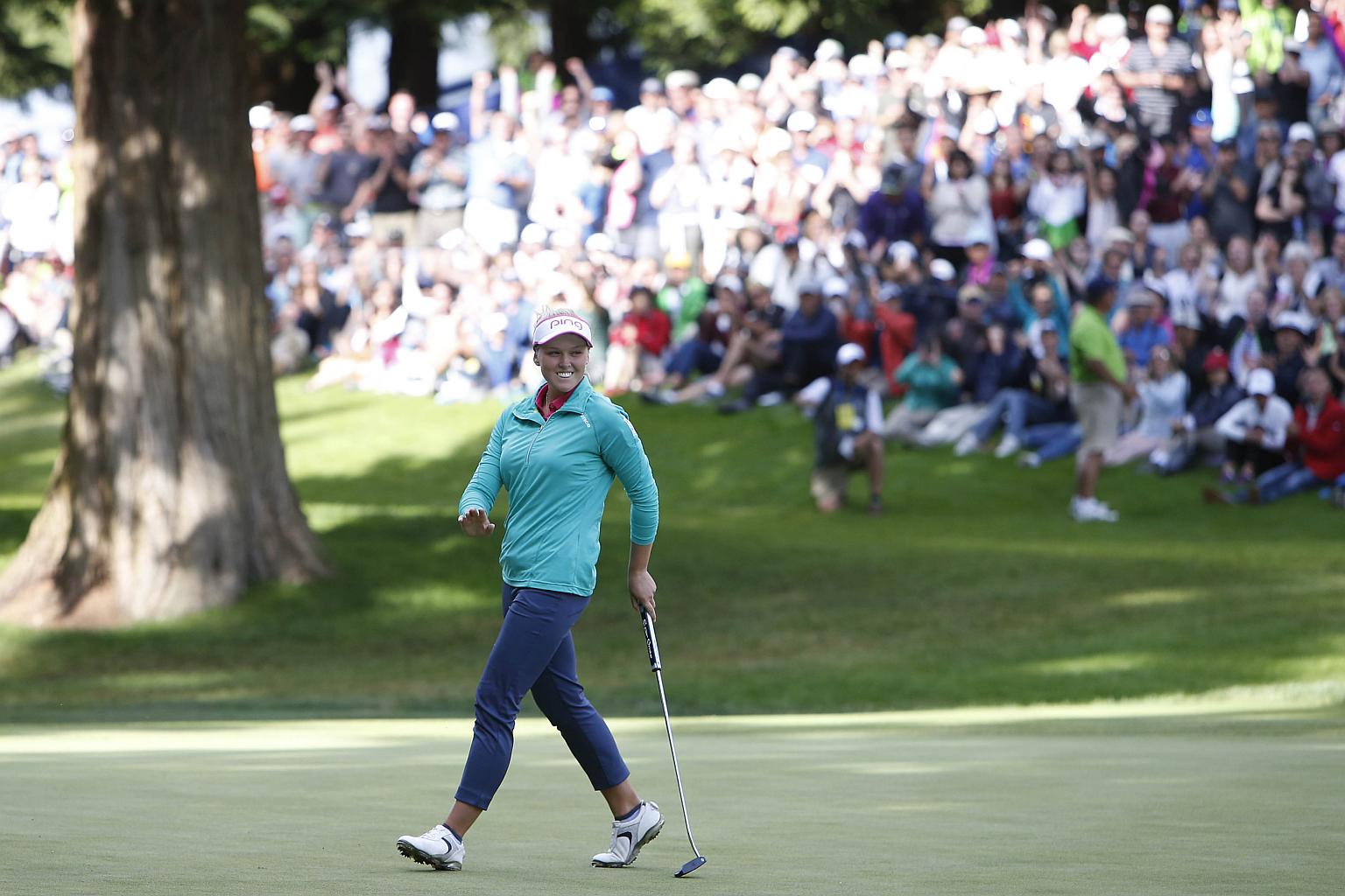 Brooke Henderson makes her putt on the eighteenth hole during the final round of the KPMG Women's PGA Championship at Sahalee Country Club - South/North Course.