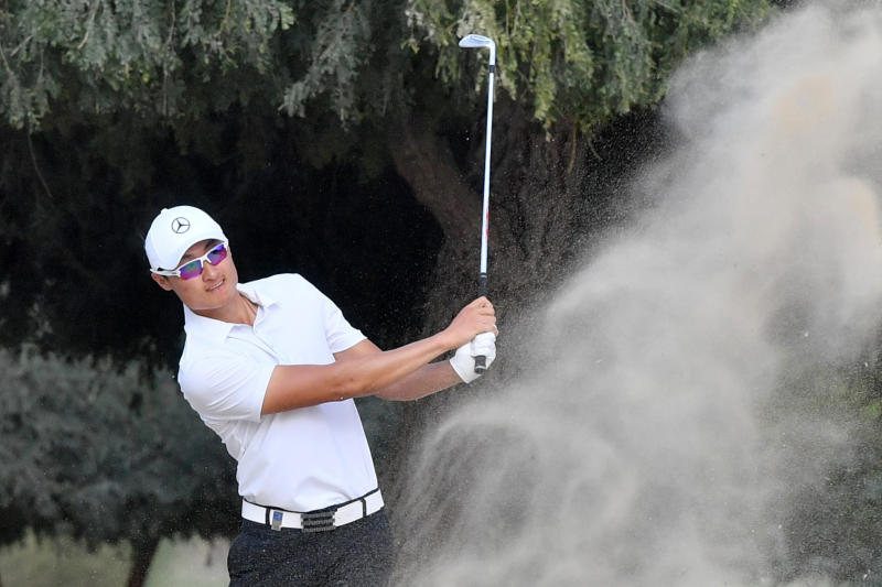 Li Haotong playing a shot during the Dubai Desert Classic in Dubai on Jan 28, 2018.