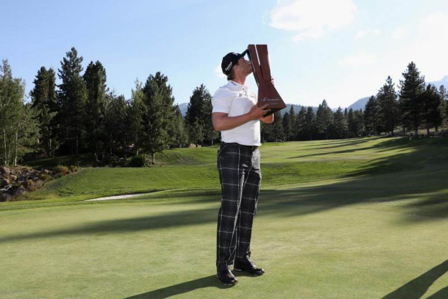 Chris Stroud poses with the trophy after winning the final round of the Barracuda Championship on Aug 6, 2017 in Reno, Nevada.