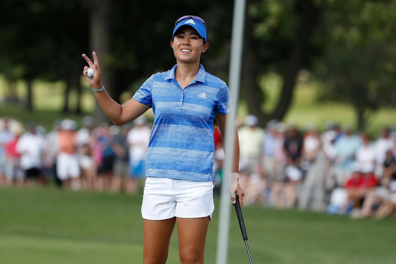 Danielle Kang waving to fans after being introduced on the 18th green during the final round of the 2017 KPMG PGA Championship at Olympia Fields Country Club on July 2, 2017 in Olympia Fields, Illinois.