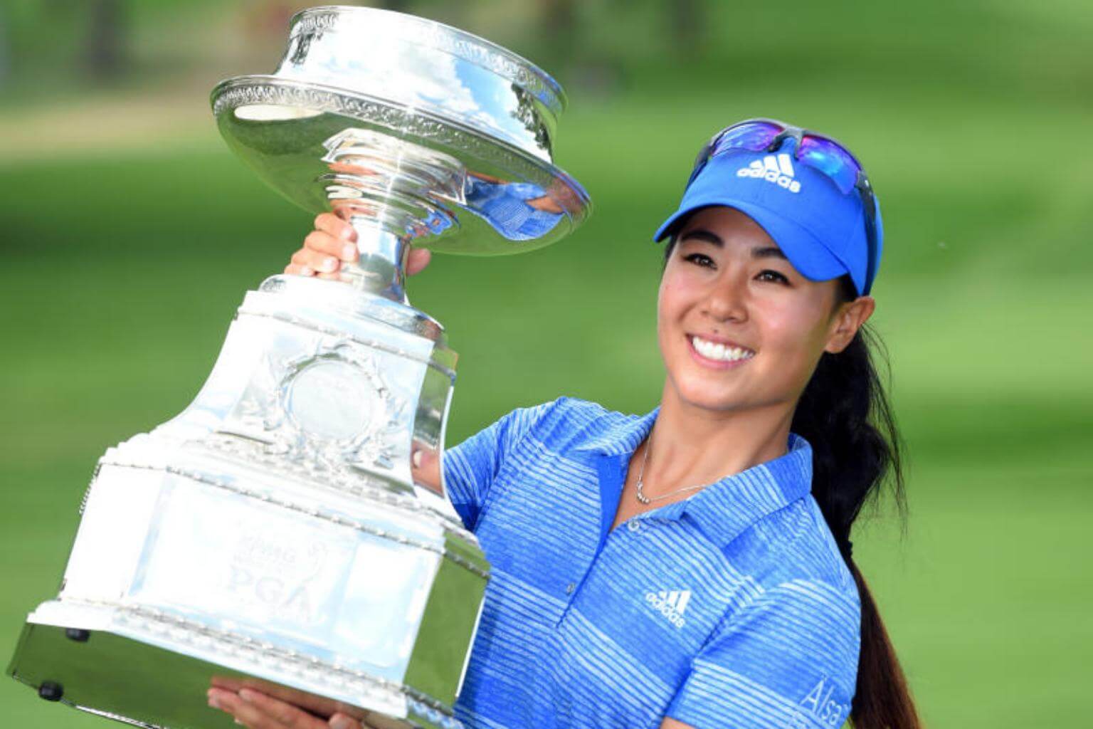 Danielle Kang poses with her trophy after winning the KPMG Women's PGA Championship golf tournament on July 2, 2017.